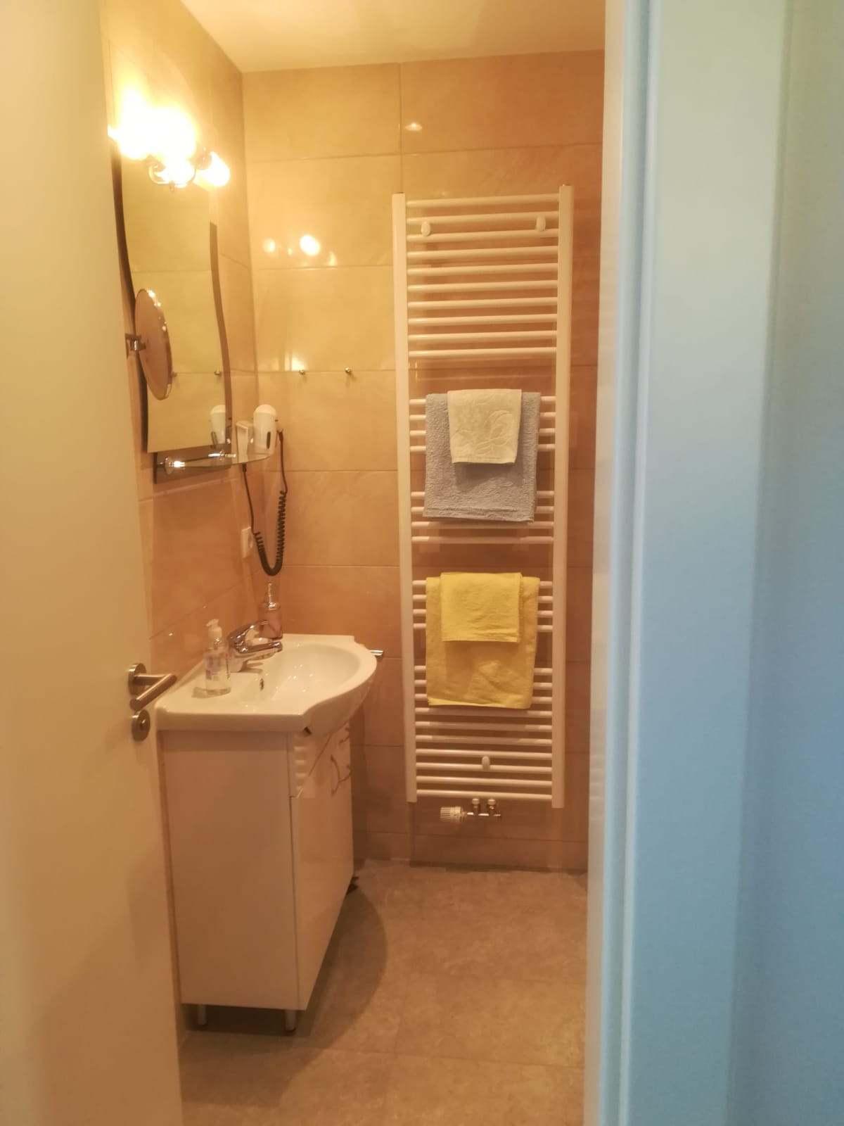 Das Schlafzimmer ist ausgestattet mit einem Doppelbett (je 2.00mx90cm), einem Kleiderschrank, Nachtkästchen und einer Umkleidebank. Das Badezimmer umfasst eine Dusche, ein WC, Waschbecken und einen Fön.